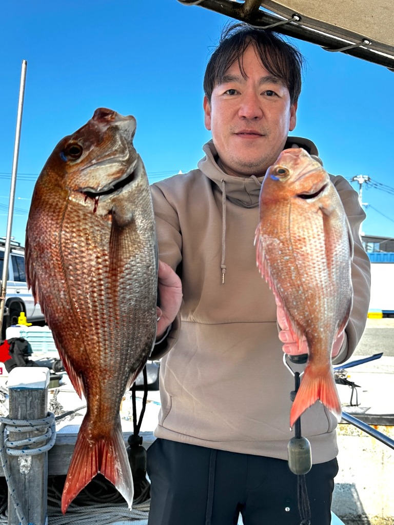 そのすぐあと他のメンバーに1匹目のマダイ30cmが釣れ、その後2匹目のマダイ45cmが揚がりました。最終4名様、竿頭マダイ2匹となりました