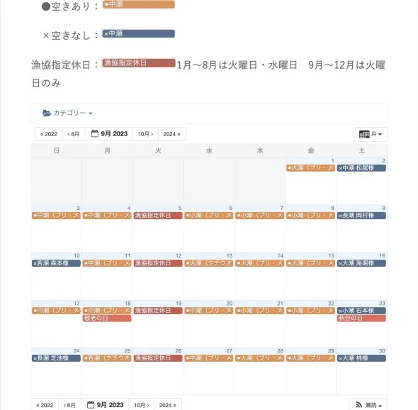 ・現在8月まで火曜日・水曜日の2日休みですが9月から火曜日のみの休みで水曜日も出船可能です