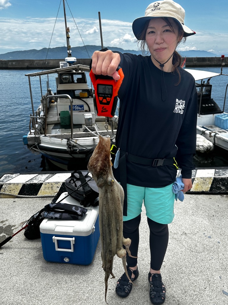 女性のかたにビッグサイズ1.37kgの紋甲イカが釣れ、後半3分前にバスプロのかたがマダコ2.7kgを、流石です。