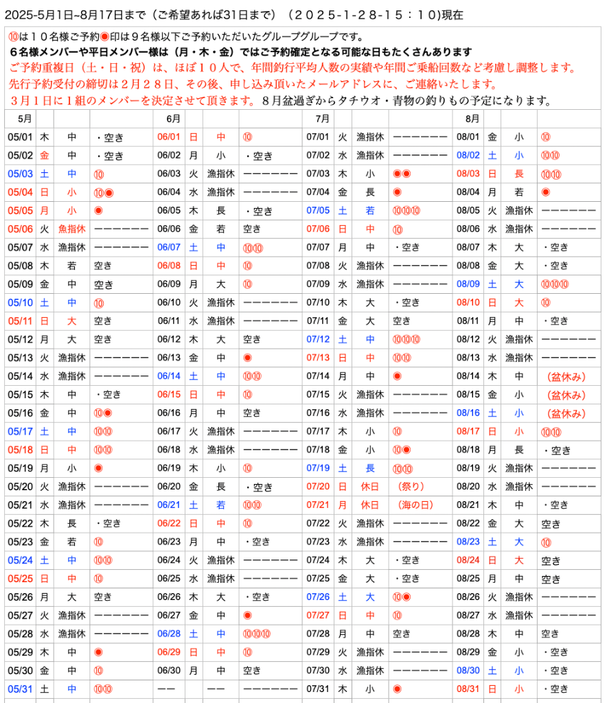 Q:『いつもの釣行メンバーは10名程度で、土日祝に新規で予約をいれたい』