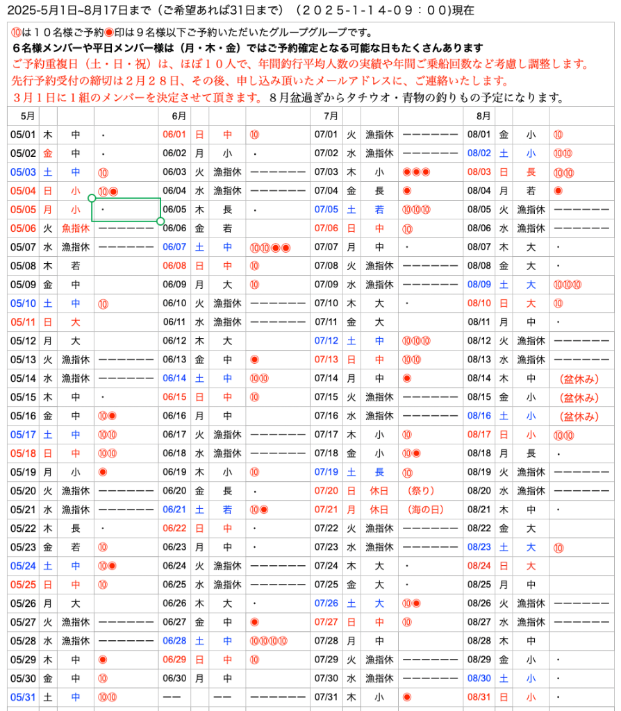 先行予約は2月28日なのでもしご予約希望に漏れたとしても、まだマダコ開始日には十分な時間がある日程にしています
