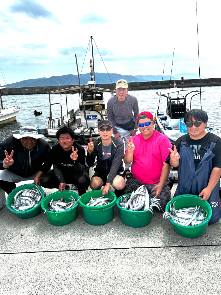 5名様の釣果でジギングのかたはサワラにサゴシほかタチウオ多数釣れています。テンヤのかたに2匹かけなど、胴月仕掛けに2匹など、釣れました